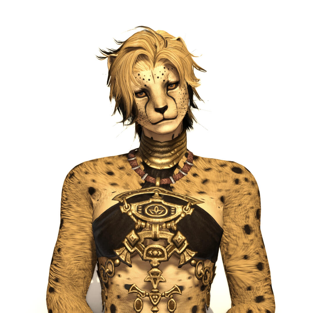 I. background......Left at the edge of the Golmore Jungle as a kit, Salomé was taken in by the Viera of a tribe she never truly felt a part of. They trained her in combat and survival; taught her of the old ways and traditions, but always kept her at an arm's length. Her distaste for battle was met with disappointment by the rest of the group, which only lead to ostracization, and in turn, punishment. She was put to work butchering animals after hunts.......The greatest solace offered to Salomé came in the form of a friend and first love, Red. His striking eye color became his namesake and was ever a source of comfort. Unspoken feelings blossomed between the two Viera after they reached maturity, however their closeness waned in the years following Red's preparations to fulfill his role as a Wood Warden.......Red's eventual return came with tragedy—the news of corruption spreading throughout the jungle, and the passing of several Wardens in an attempt to contain it. Sal discovered Red was its source soon after his return. The parts of Red that were left pleaded for Salomé to end his suffering.......Unable to stay with the tribe after honoring his request, Salomé left for the city of Dalmasca. There, she discovered she was pregnant. She travelled to Eorzea in search of answers after each subsequently failed attempt at honoring her love's final request. The process left the Viera permanently marked from the unnatural influence forced to grow within her body.......Now, Salomé lives her life as a simple butcher, traveling from city to city and searching for distractions to leave her past behind.